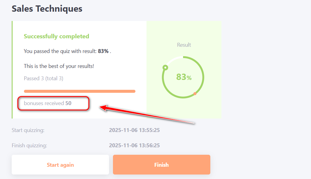 The accrued number of bonuses is displayed to the user immediately after completing the task on the finish page: