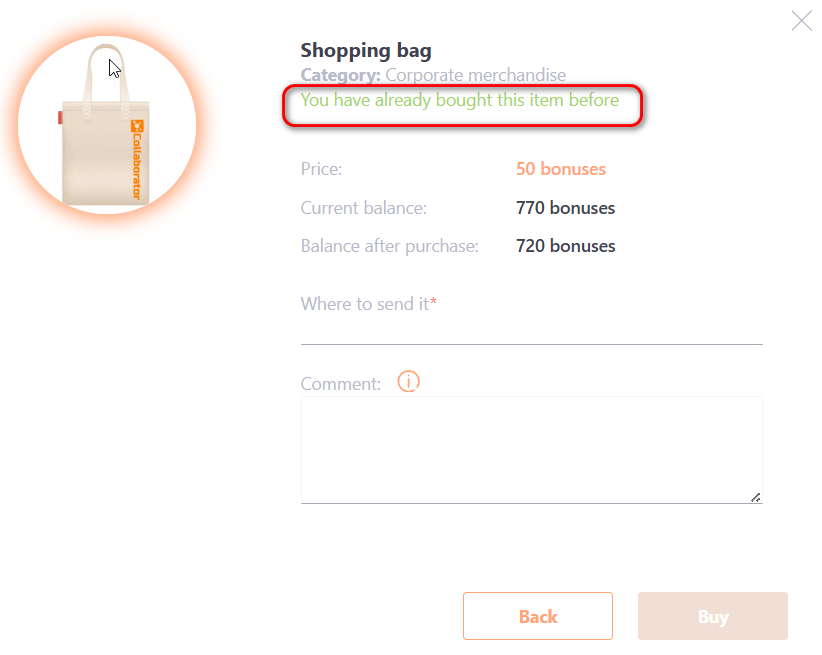 If a user has already purchased a gift and opens its card again, a notification is displayed in the gift card indicating that the gift has already been purchased.