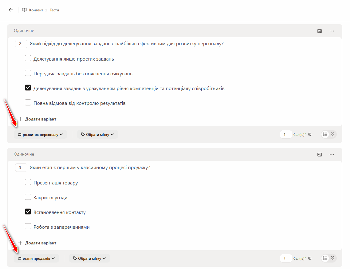 Зазначені групи для запитань відображаються внизу кожного питання: