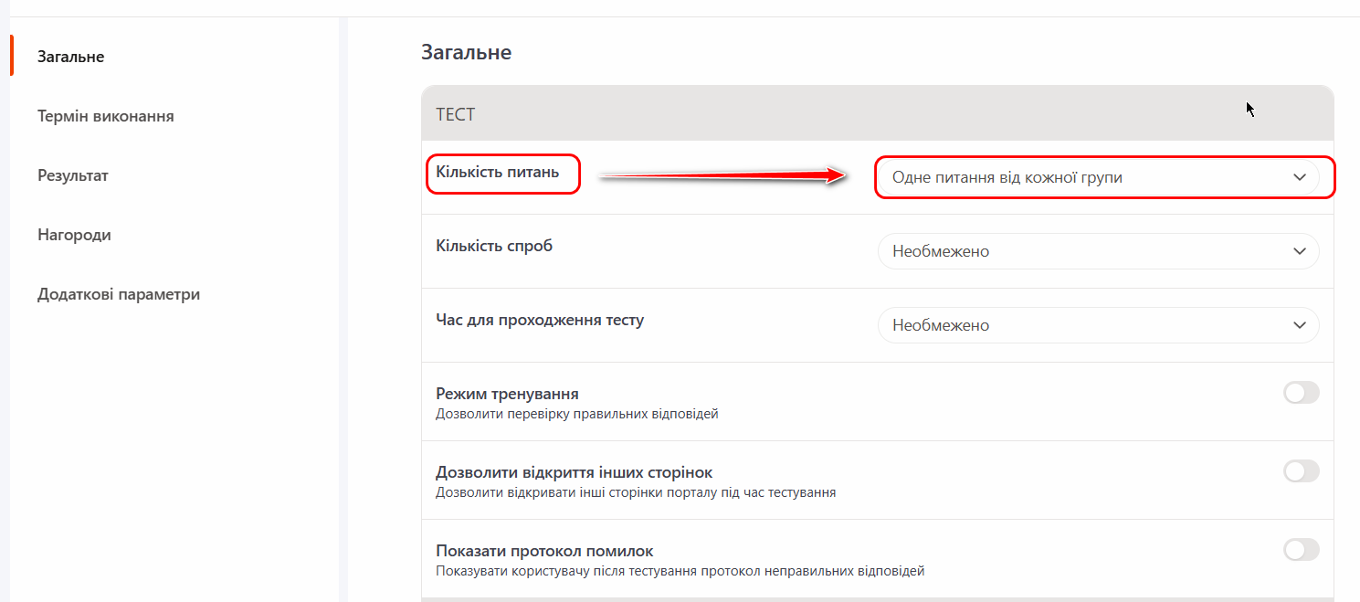При створенні Завдання з використанням тесту (детальніше Створення завдань-тестів) в налаштуваннях можна обмежити кількість питань в тесті щодо раніше вказаних груп. У вибірку тестування потраплять по одному випадковому питанню з кожної групи. Для різних користувачів вибірка питань буде різною. Налаштування автоматично визначає скільки груп є у тесті і відповідно стільки запитань буде поставлено.
