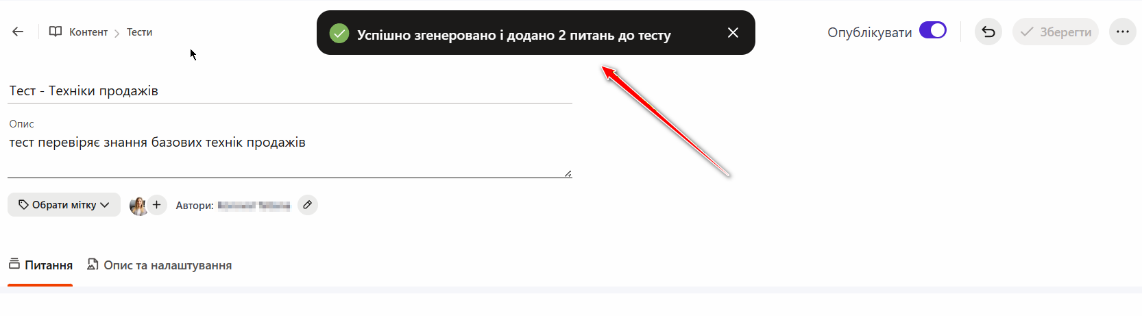 Після завершення завантаження файлу в тесті з'являється перелік питань та відображається модальне вікно, де зазначена кількість імпортованих питань.