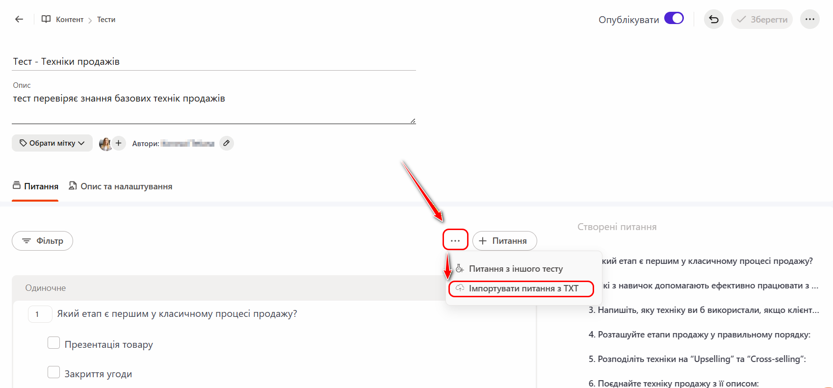 На сторінці Теста, до якого необхідно додати питання, потрібно натиснути кнопку Дії і обрати опцію Імпортувати питання з TXT:
