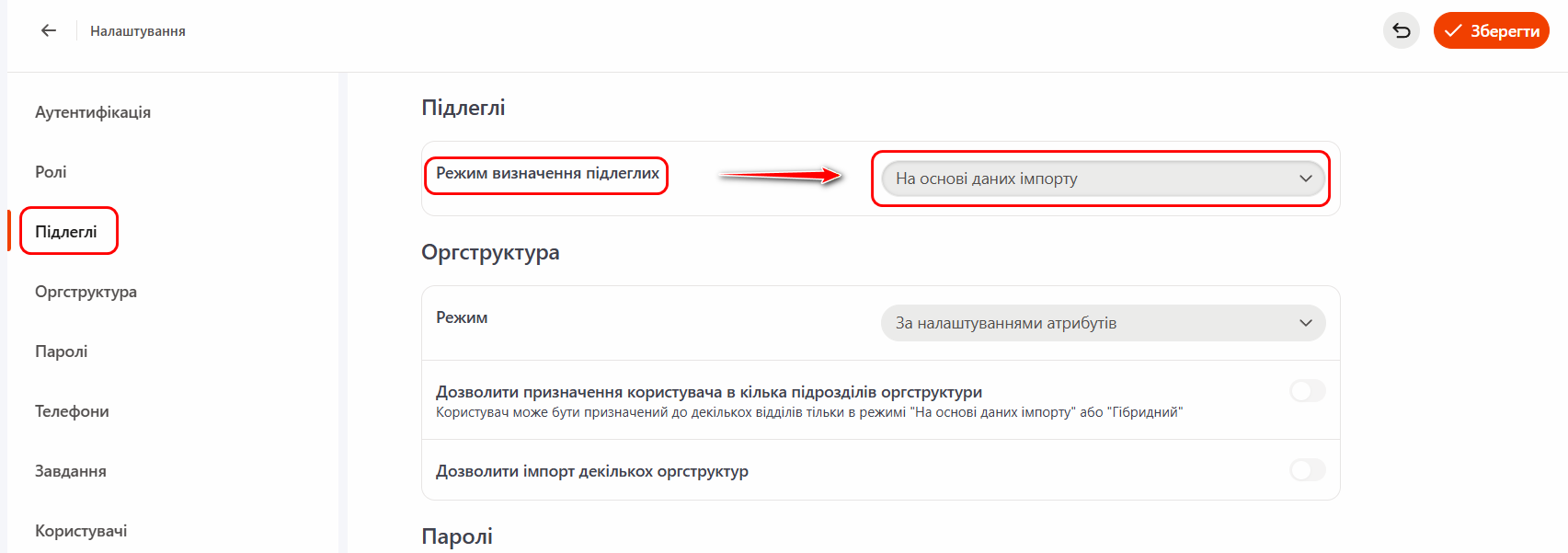 Також потрібно в Налаштуваннях системи => Політики => Підлеглі увімкнути Режим визначення підлеглих: На основі даних імпорту. Після цього налаштування система не буде визначати керівників за допомогою оргструктури і керівних посад, а всі посади більше не розподіляються на керівні і підлеглі.