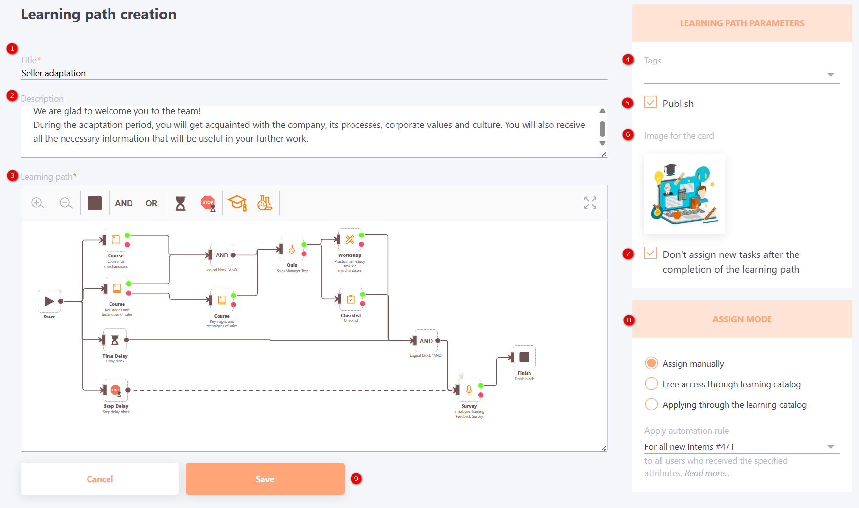 - Save button" (9) - button to save the learning path. It becomes active when the required fields are filled in and at least one task is added in the path editor and all elements are connected.