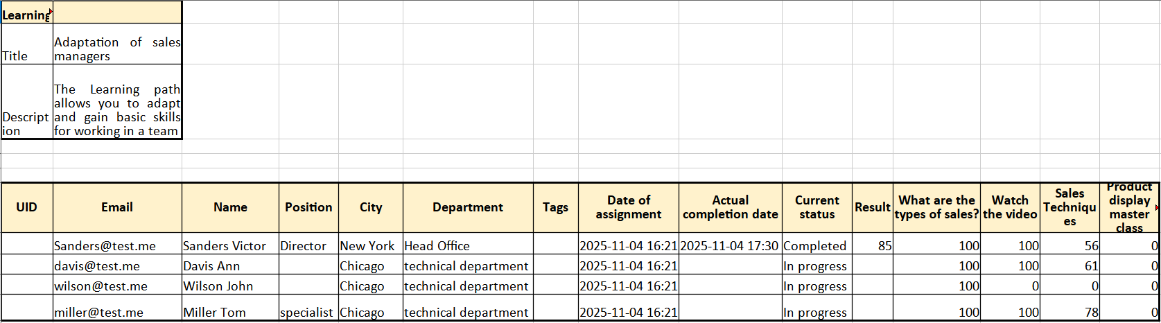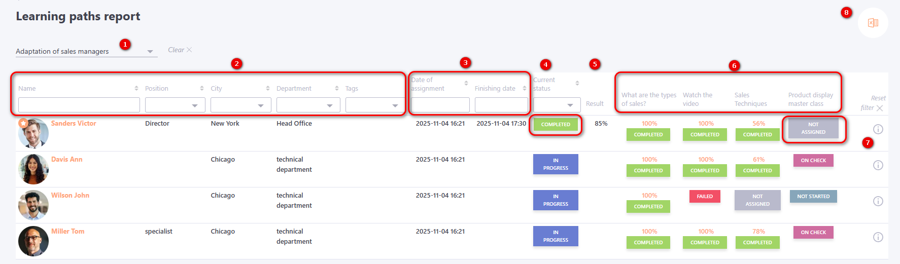 (4) - Current status of the user's learning path : In Progress - after the path is assigned, Completed - after it’s finished when the user has reached at least one Finish block.