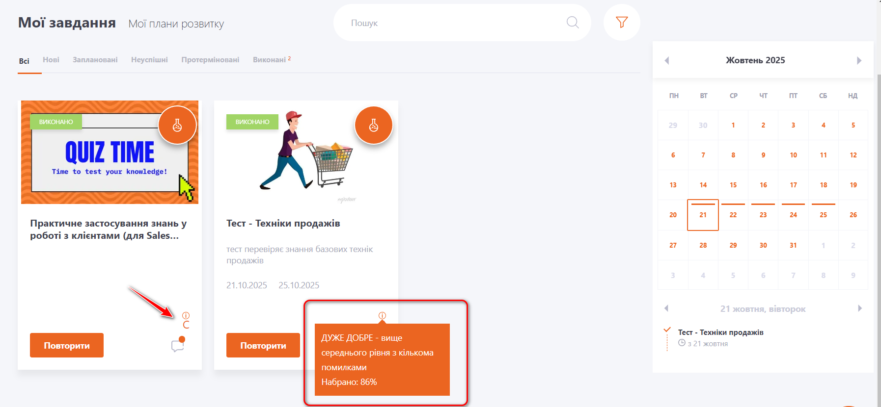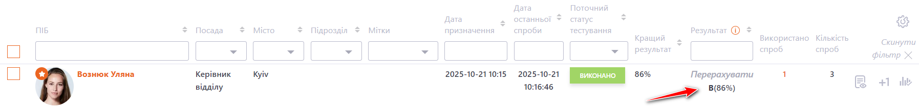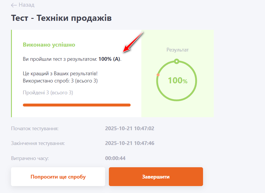 Результат за шкалою на фінішній сторінці пройденого Тесту або Комплексного тесту: