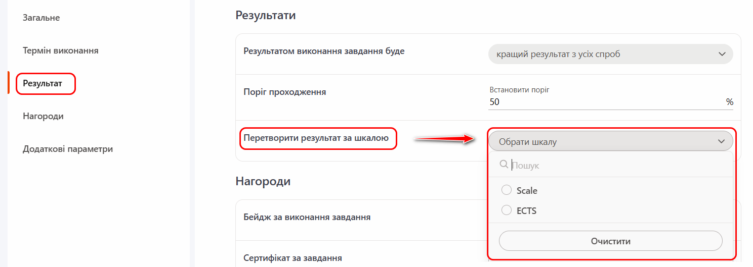 Додати шкалу оцінки можна при створенні завдання курсу або тесту, вибравши зі списку Перетворити результат за шкалою одну з раніше створених шкал. Налаштування оцінки тестів та курсів за шкалами також доступні під час створення Плану курсу та Складу програм.