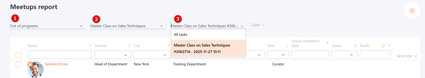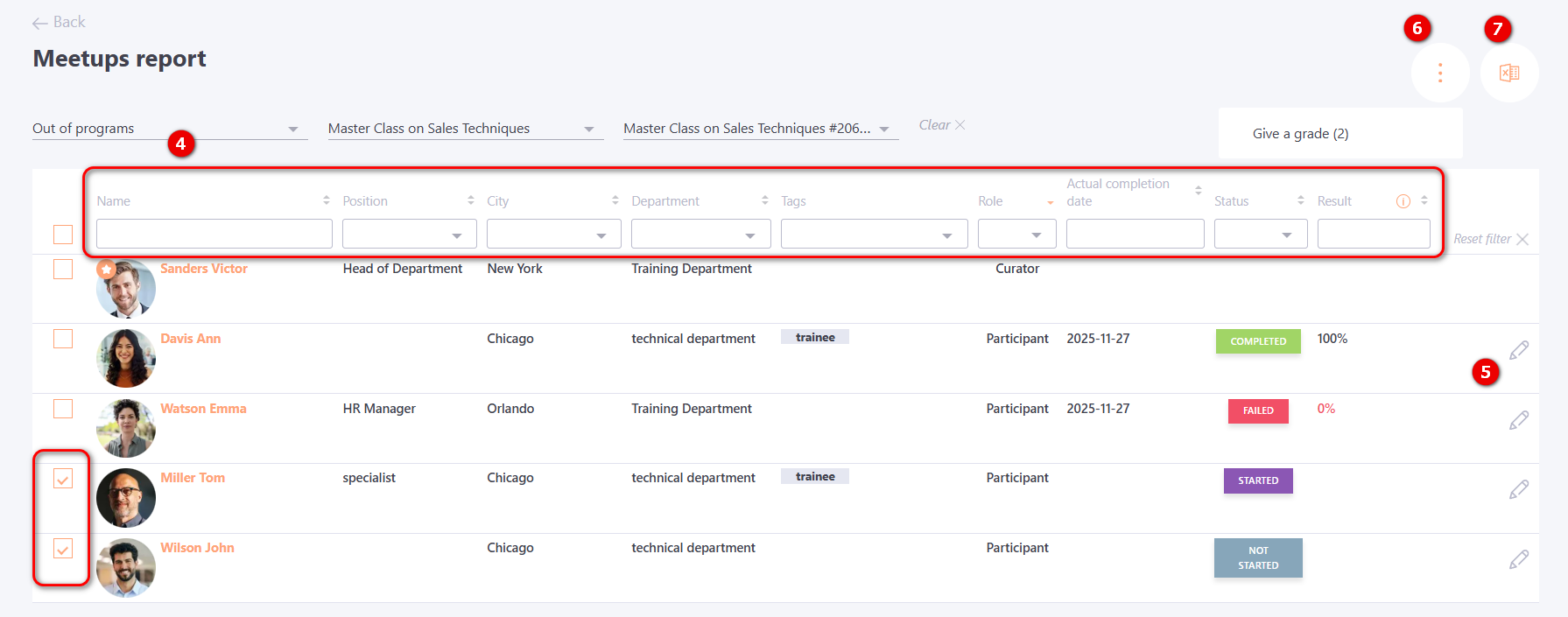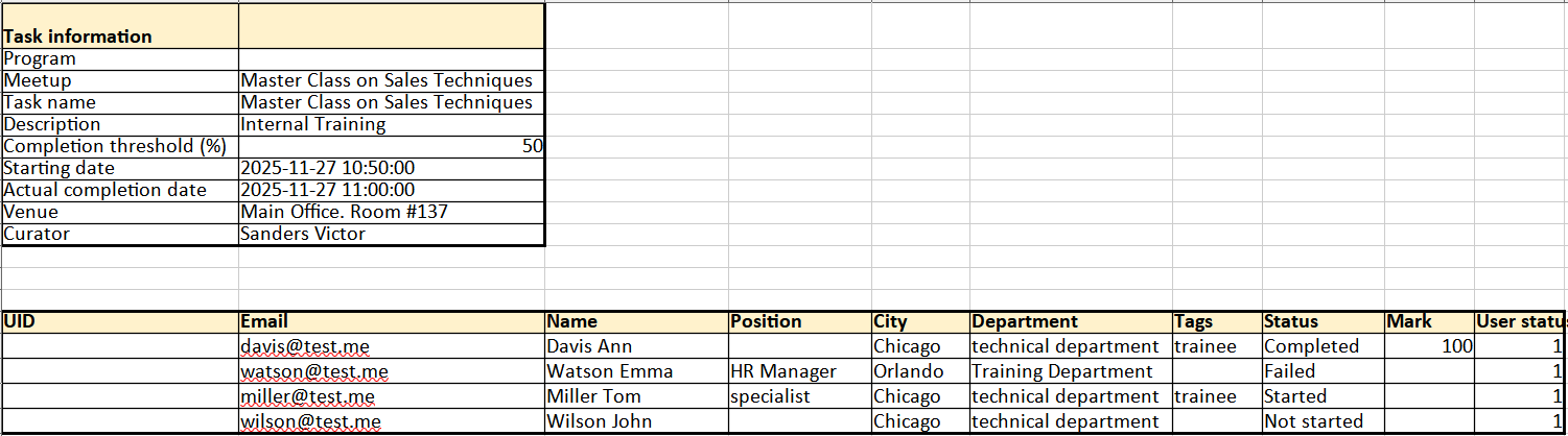 Next, a table is displayed with the users assigned to the task. It contains information for each user: avatar, full name, position, city, department, tags, role (curator or participant), as well as the actual completion date, task status, and result (4).