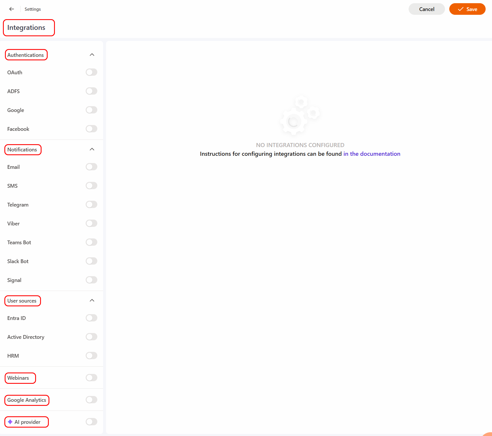 All available options for integrating LMS Collaborator with third-party applications can be configured on the Integrations page in the System settings menu:
