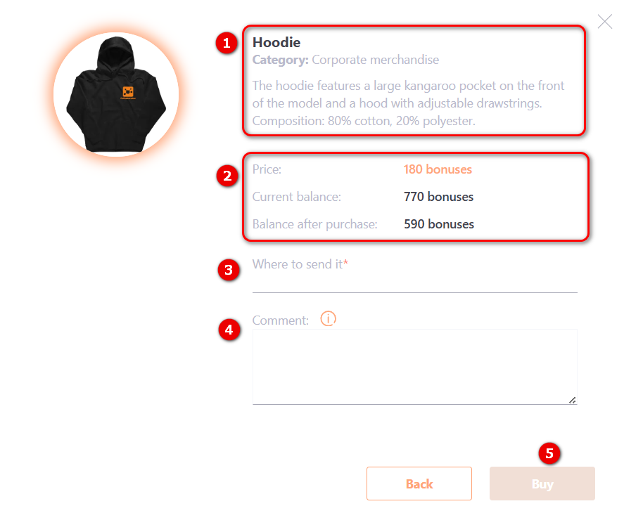 (5) – Buy button – to receive the gift, the user must click this button. It becomes active after the mandatory Where to send it field is filled in.