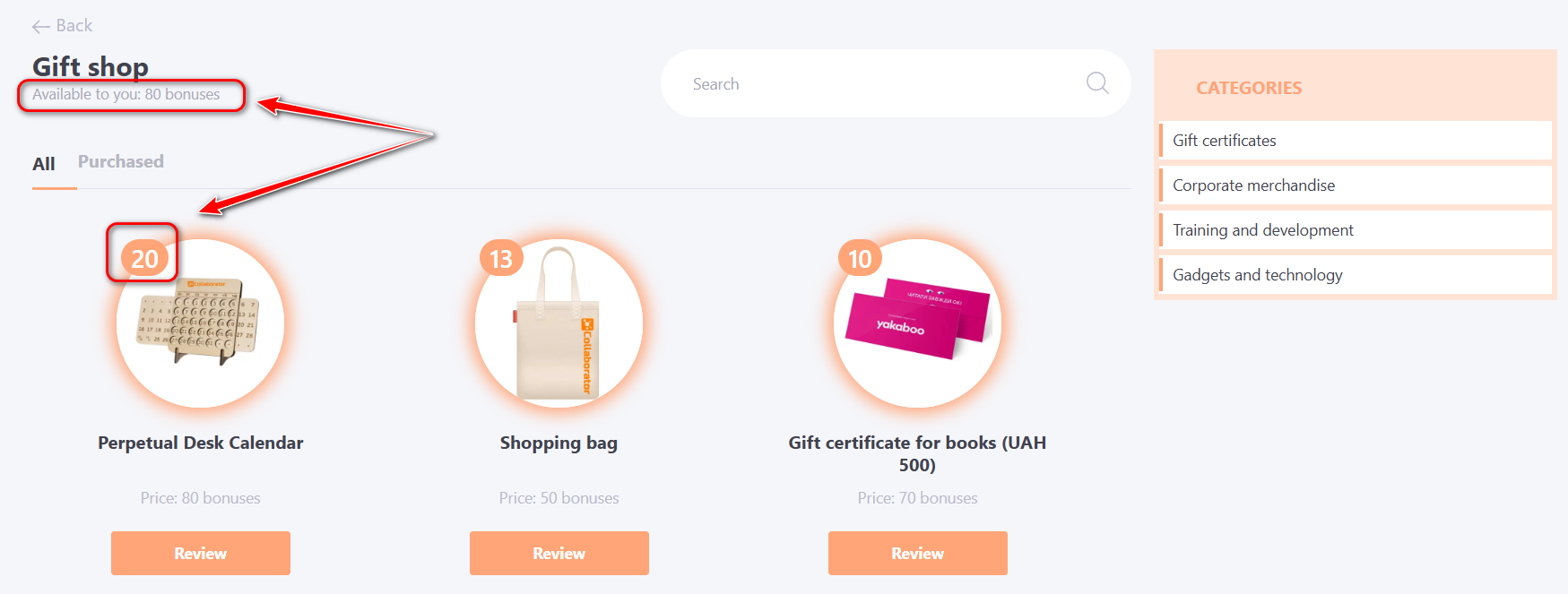 - Available gifts - are those whose value in bonuses corresponds to the number of bonuses accumulated by the user. These gifts are highlighted in the primary color of the learning portal.