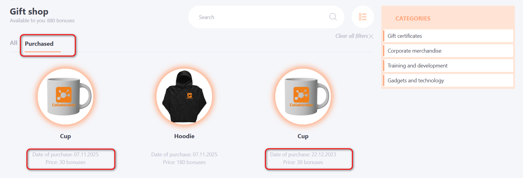 To view all purchased gifts, go to the Purchased tab. This tab can also be accessed from the user profile (see more in Viewing the gift shop).