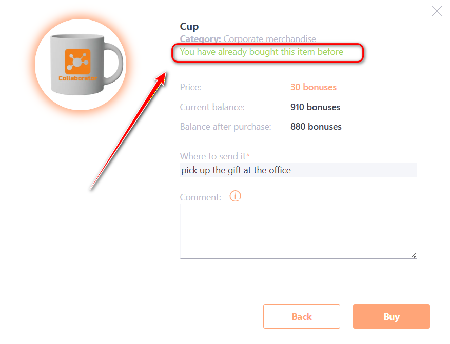 When viewing the card of an item that the user has already purchased, a message will be displayed indicating that the item has been previously bought.