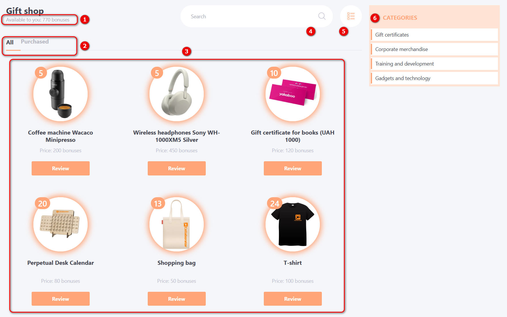 (5) - Gift store management button – available to Administrators. For more details, see Adding gifts;