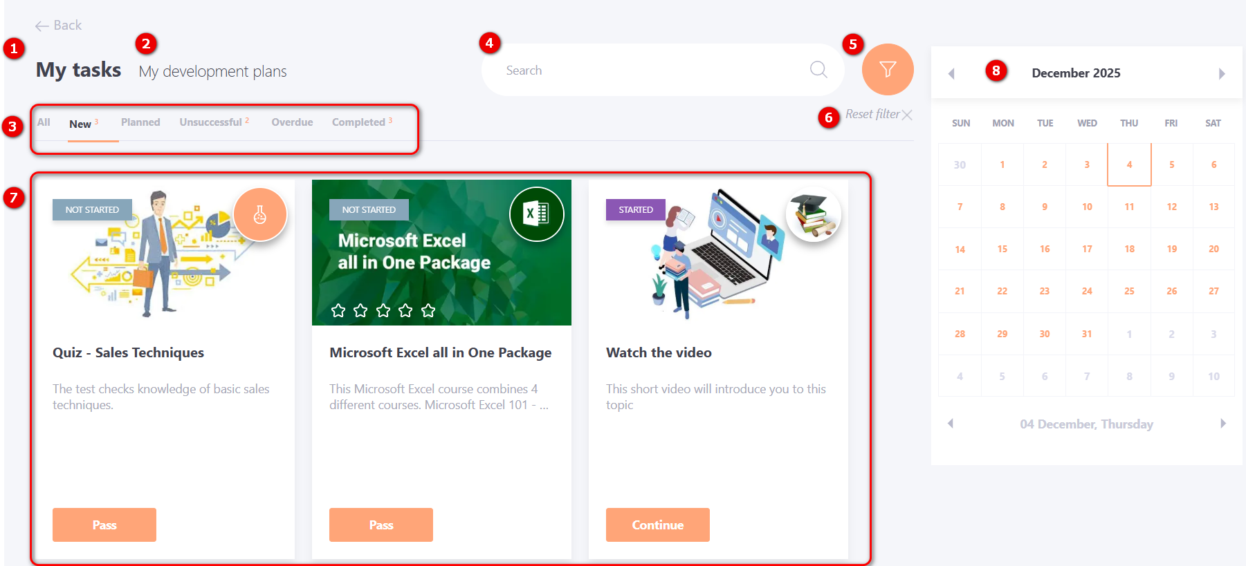 - "Repeat" – appears for tasks with the "Completed" or "Failed" status. If enabled in the settings, the user can retake the task to successfully complete it (in the case of "Failed") or to improve a previous result.