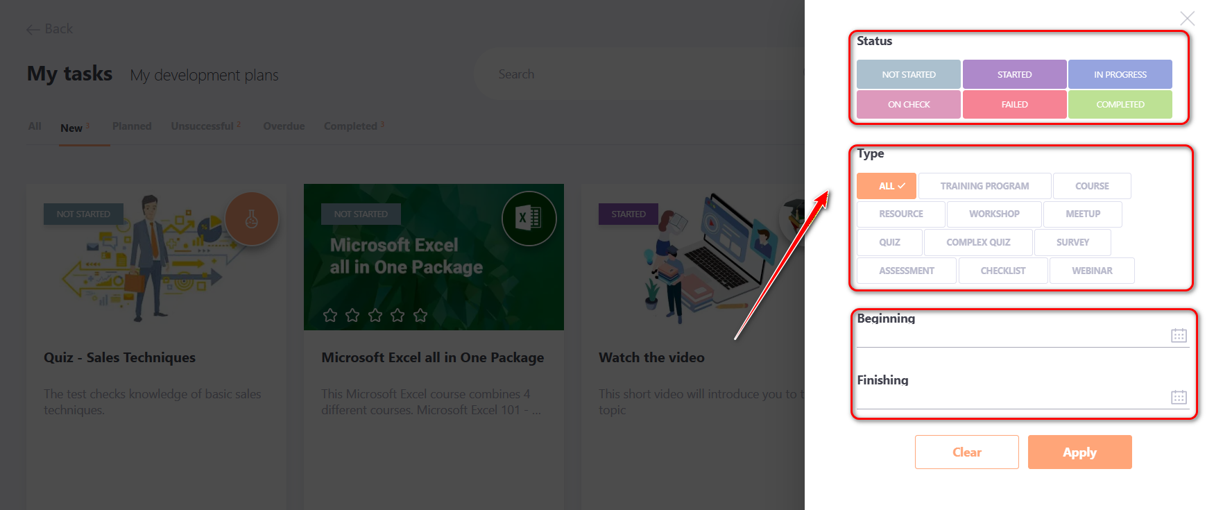 - "Review" button is displayed for tasks of the following types: survey, webinar, meetup, assessment and checklist with the status "Completed" or "Failed", when retaking such tasks is not possible.