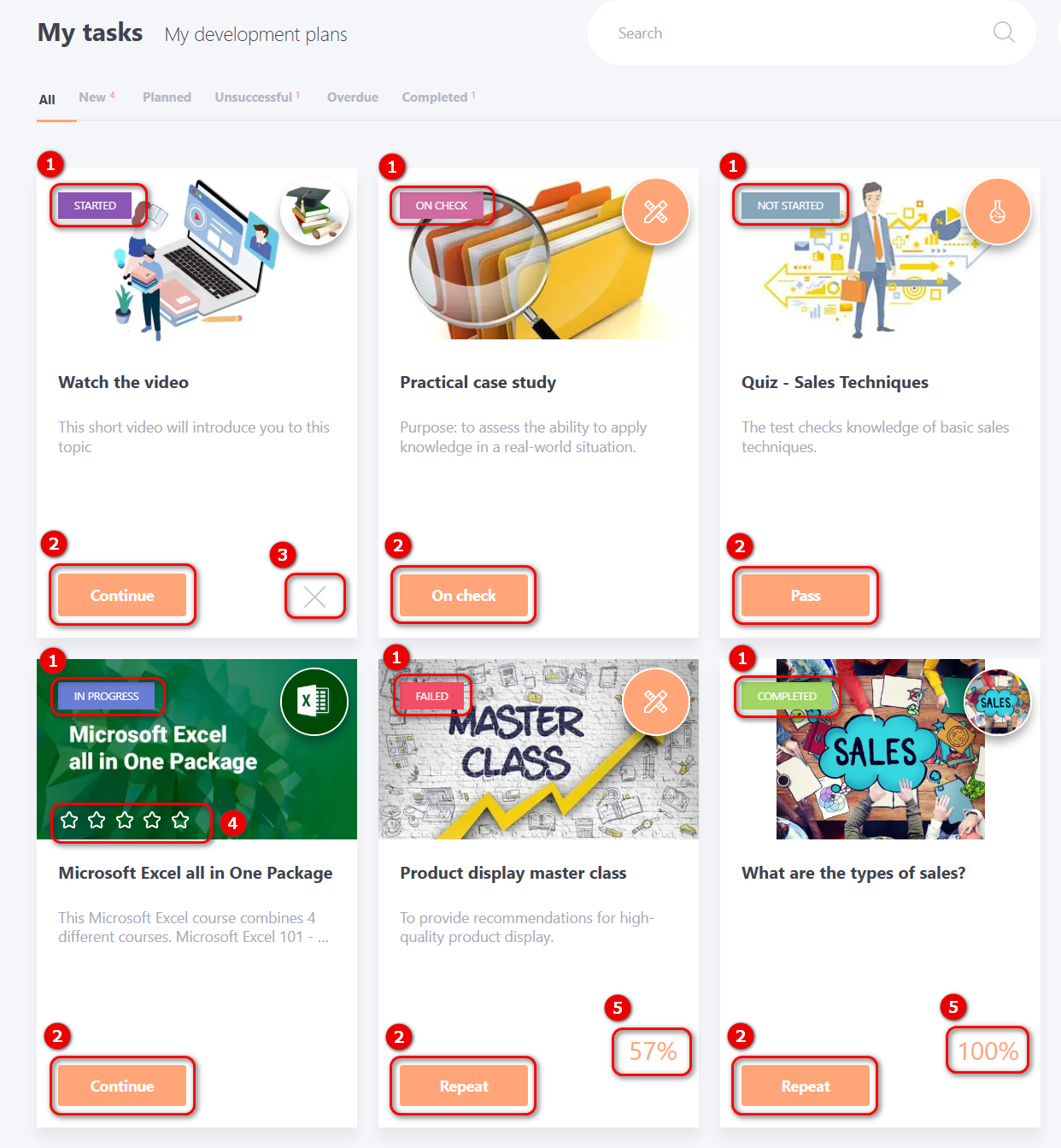 Each task card contains the following information about the task: its name, completion status (1), and the corresponding action button (2).