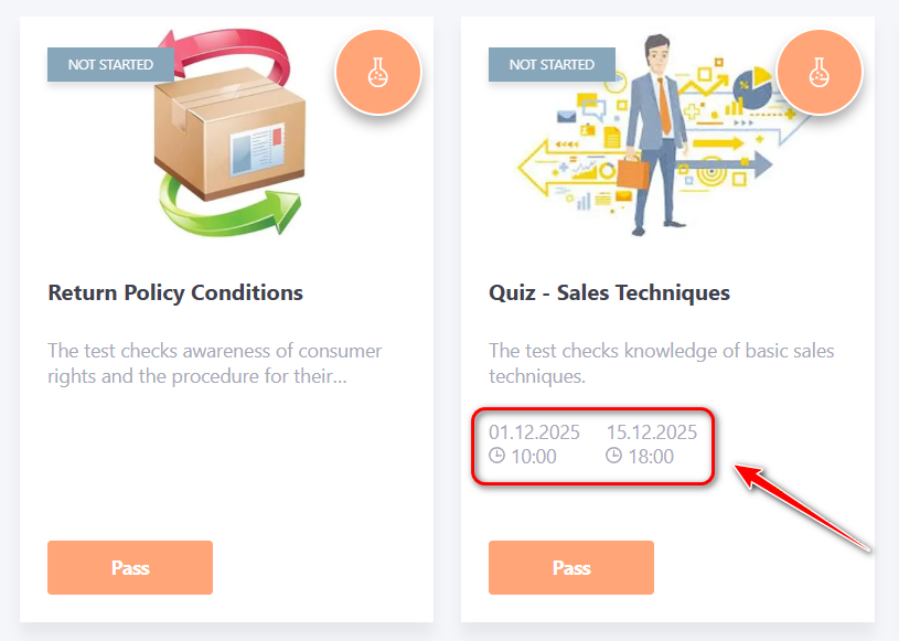 For tasks with a limited completion period set in the settings, the task card displays the start and end date and time. The task can only be completed within this specified period; after the end date, completing the task is no longer possible.