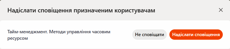 Після натискання кнопки Керування сповіщеннями відкриється модальне вікно з назвою завдання, термін якого було змінено. Тут можна вибрати одну з дій: "Надіслати сповіщення", щоб поінформувати користувачів або "Не сповіщати", щоб внести зміни без розсилки.