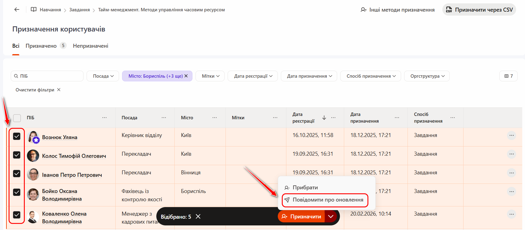 - відзначити чек боксами всіх користувачів, яких необхідно сповістити;