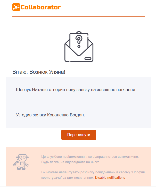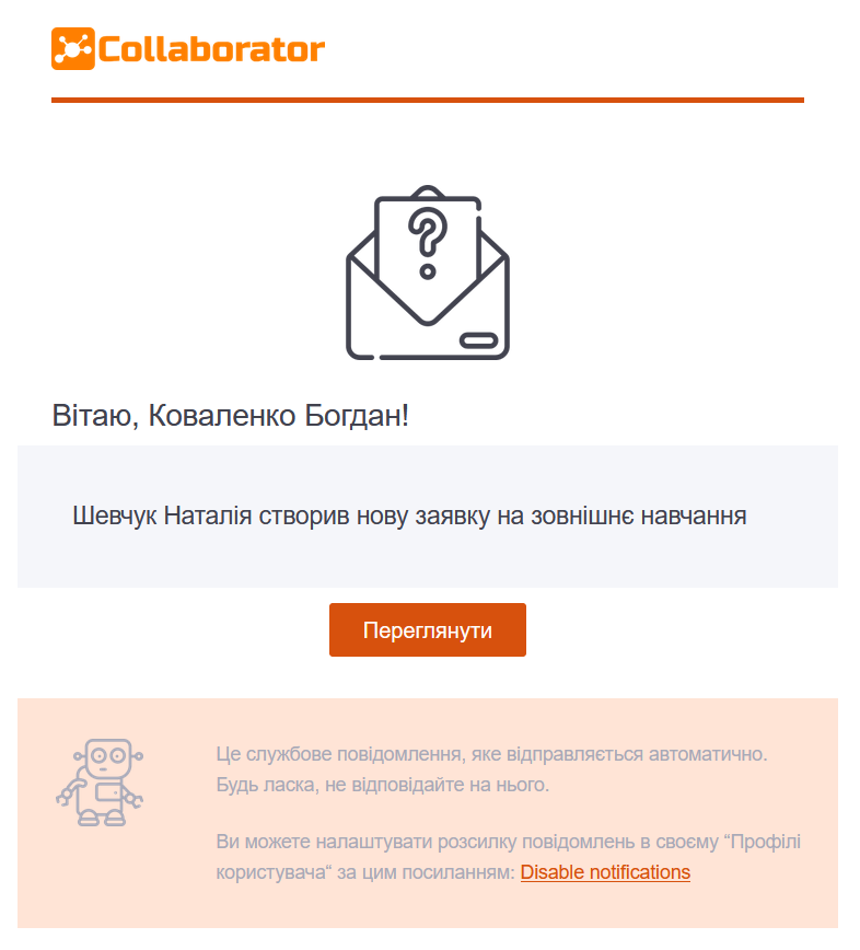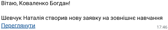 Сповіщення відповідальному адміністратору про те, що користувач подав заявку на зовнішнє навчання.