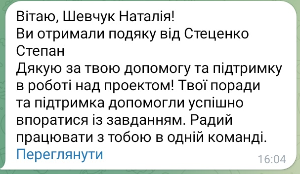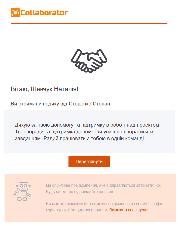 Повідомлення користувачу про те, що йому було надіслано подяку від іншого користувача. В повідомленні міститься ім'я користувача, який надіслав подяку, а також текст подяки і посилання на неї.