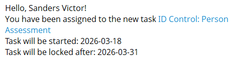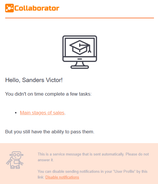 The notification is sent to the user after the expiration of the specified period of completion of this task, provided that the Do not block access after expiration date option is enabled (find more in Expired tasks). You can enable and configure the conditions for sending the reminder on the page with the list of tasks (find more in Tasks Reminder).