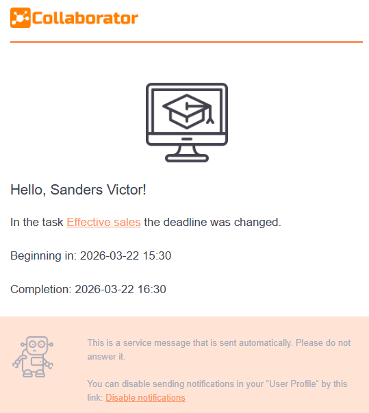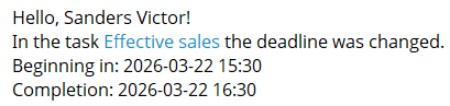 Notification about the change of the task deadline. The notification is sent to the users assigned to this task after clicking the Yes button in the notification on the page with the list of tasks, that appears after changing the deadline for the task. Find more in Tasks - The deadline for the tasks was changed.
