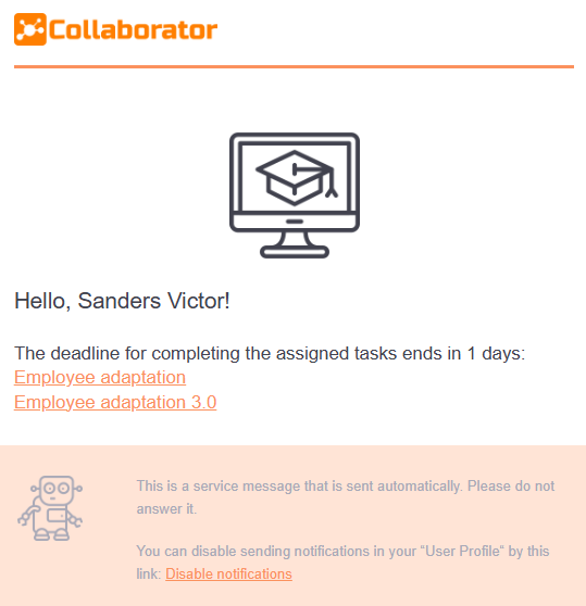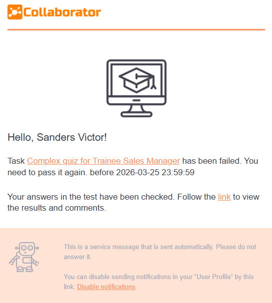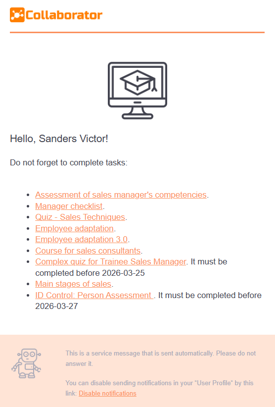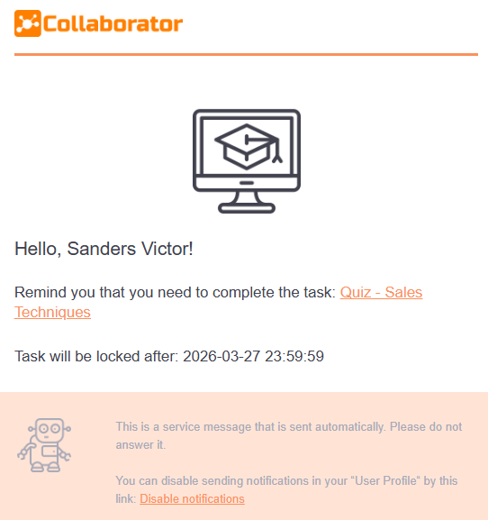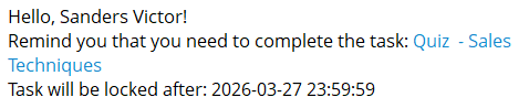 Please note! The mailing does not include tasks for meetups and webinars, as well as quizzes in which all attempts to pass are over and the option Disable the possibility of requesting an additional quizzing attempt is enabled.