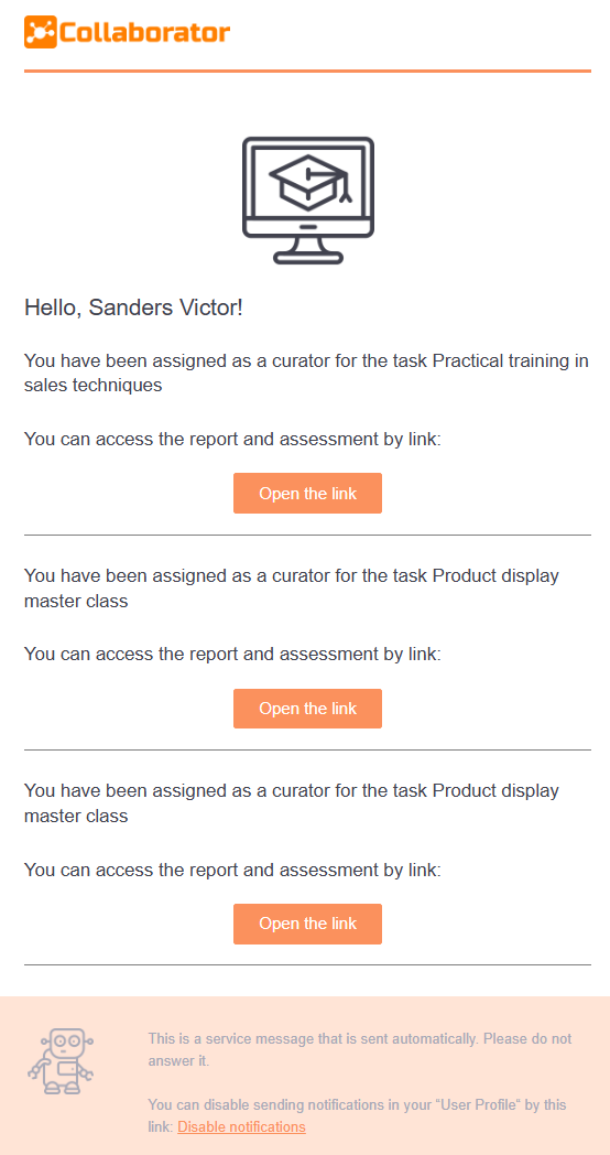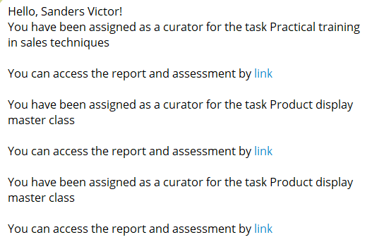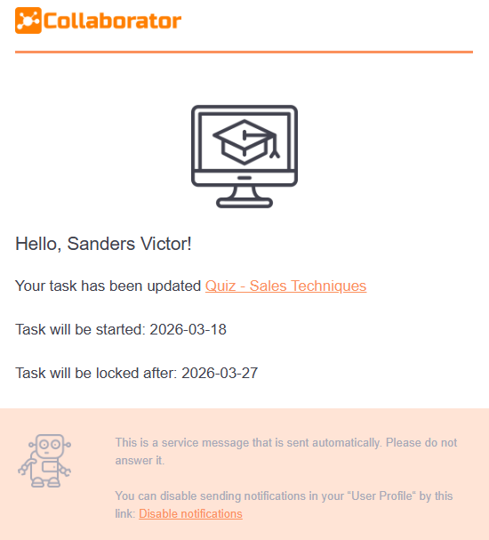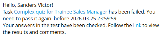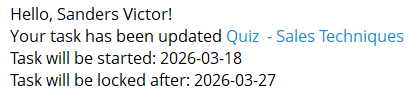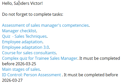 Notification to the user about the assignment of a new task. The notification displays the task name and a link to the task. Also, the notification indicates the deadline (if when creating the task you specified relative or calendar period) та learning path title (if the task is assigned to the learning path) with a link to passing learning paths.