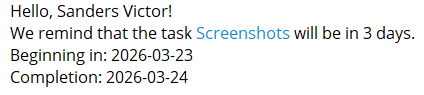 Notification that the task will start in three days. The notification is sent to users who were assigned to the task before the due date. Such tasks appear in the Planned tab in My tasks. Three days before the task start date, the user will receive an automatic reminder at 07:00 based on this template.