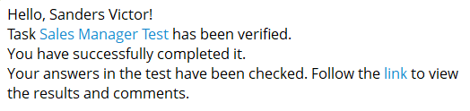 Notification to the user about the successful completion of the task after checking by the Curator. That is, notifications are sent only for tasks with workshops or free-response tests. If the workshop/quiz is part of a course/program, the name of the course/program is indicated in the notification.