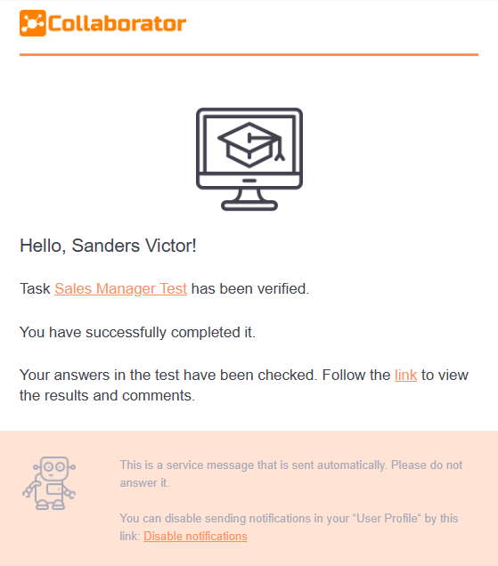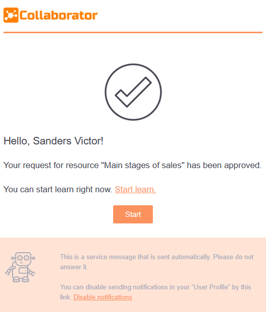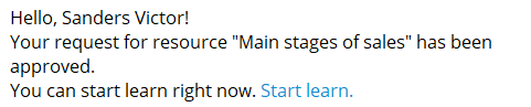 Notification to the user about the approval of the request for the task from the Catalog (find more in Registration for tasks in the catalog). The notification is sent after the Administrator clicked on the Accept button in Requests for learning.