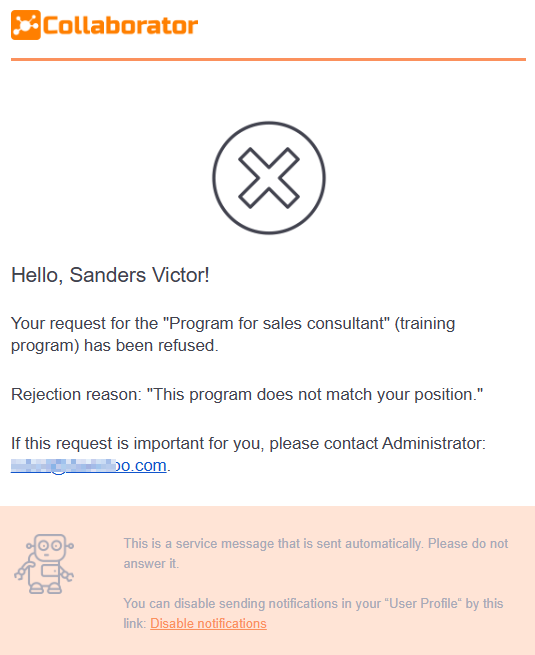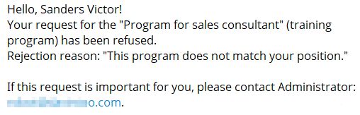 The message is sent after the Administrator clicked on the Reject button in Requests for learning. The message may also display the reason for the refusal, if the Administrator has specified it.
