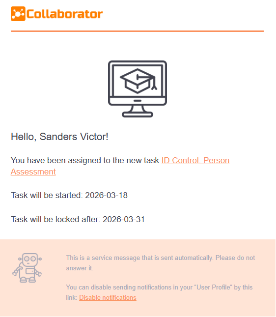 Notification to the user about the rejection of the application for the task from the Catalog (find more in Registration for tasks in the catalog).