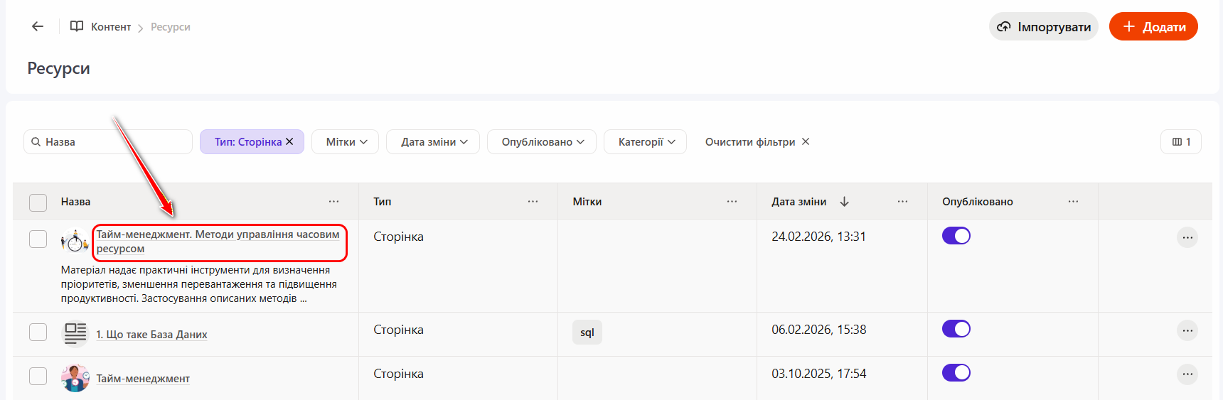 Для Ресурсу типу Сторінка основним інструментом редагування є TinyMCE редактор (1). За його допомогою користувач може створювати текстові ресурси будь-якої складності. Також у будь-який момент можна вносити зміни до вмісту ресурсу. Для створення та редагування ресурсів надано низку інструментів для редагування/форматування тексту та вставки ресурсів, відео, посилань, таблиць, шаблонів тощо. Цих інструментів достатньо, щоб професійно підготувати інформацію.