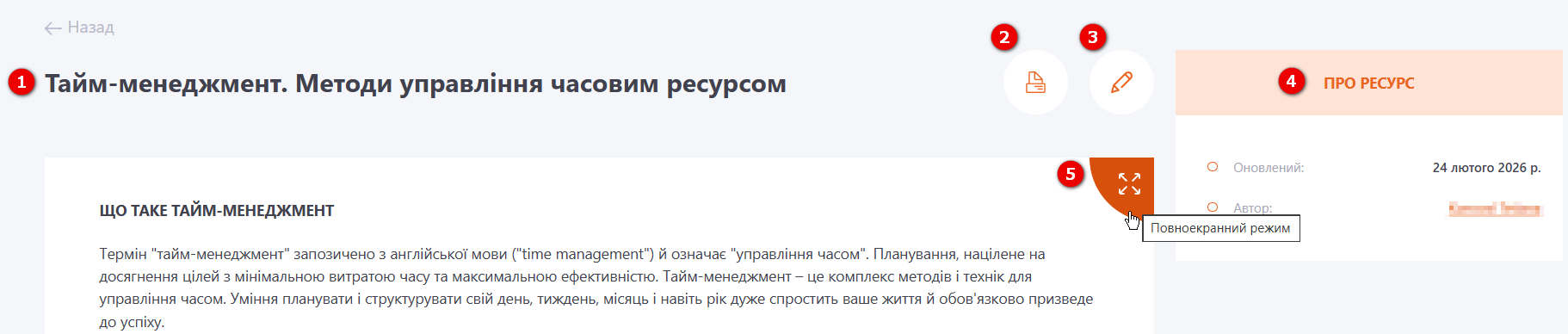 (5) - Повноекранний режим – можливість перегляду вмісту Ресурсу на повному екрані. (Кнопка не виводиться для дуже коротких ресурсів, з висотою менше 200px).