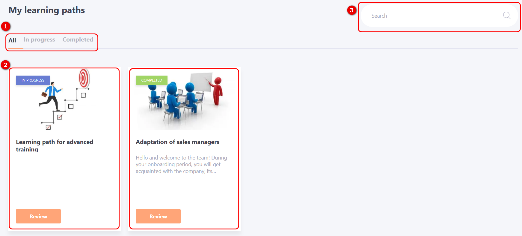 Here you can see the cards of all assigned paths with passing statuses (1). You can search by trajectory name (2) and filter by status (3).