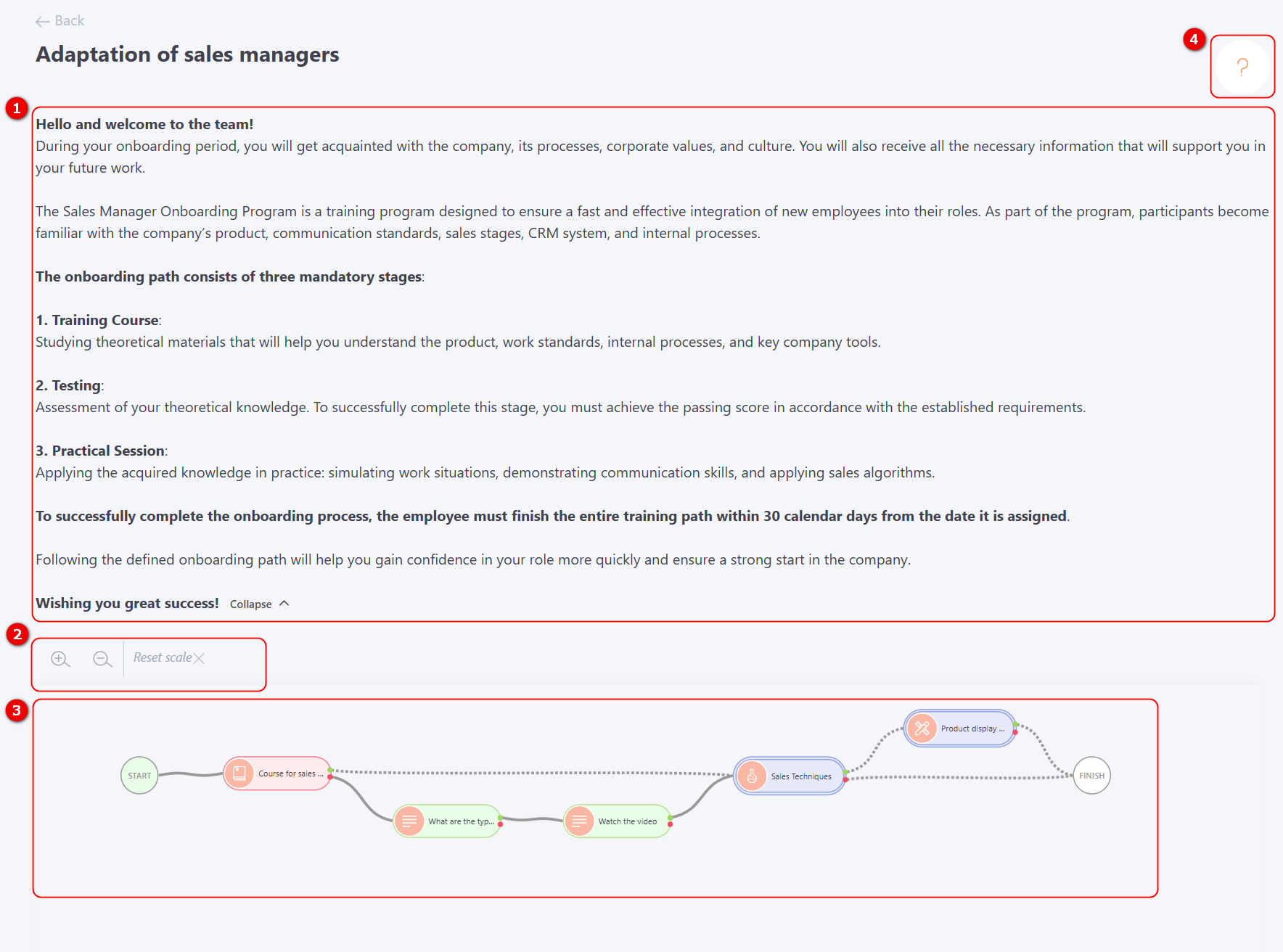 Clicking on the Review button opens a page where the user can see what tasks it contains. And also, to track the route of the learning path, the conditions of performance and assignment of tasks.