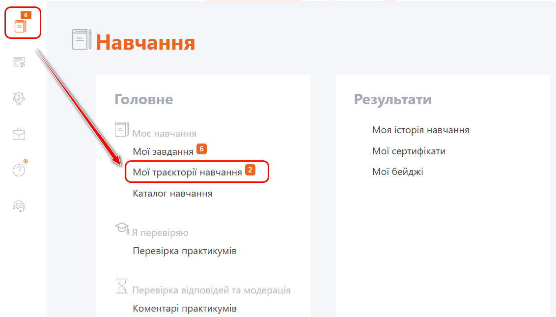 Біля пункту меню Мої траєкторії навчання буде відображено кількість призначених непройдених траєкторій навчання для користувача.
