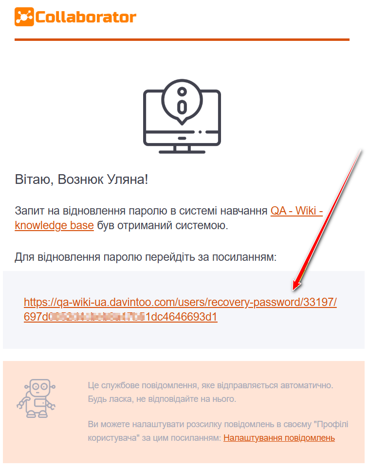 На пошту надійде лист з посиланням на сторінку створення нового паролю. Перейдіть за посиланням.