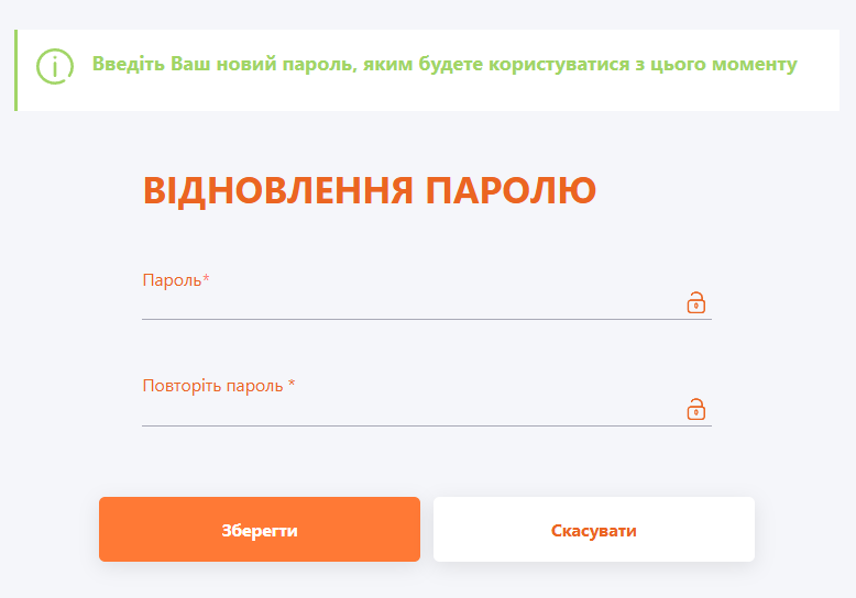 Введіть новий пароль в поля Пароль та Повторіть пароль. Після цього натисніть кнопку Зберегти, щоб підтвердити дію. Або натисніть кнопку Скасувати, щоб відмінити.