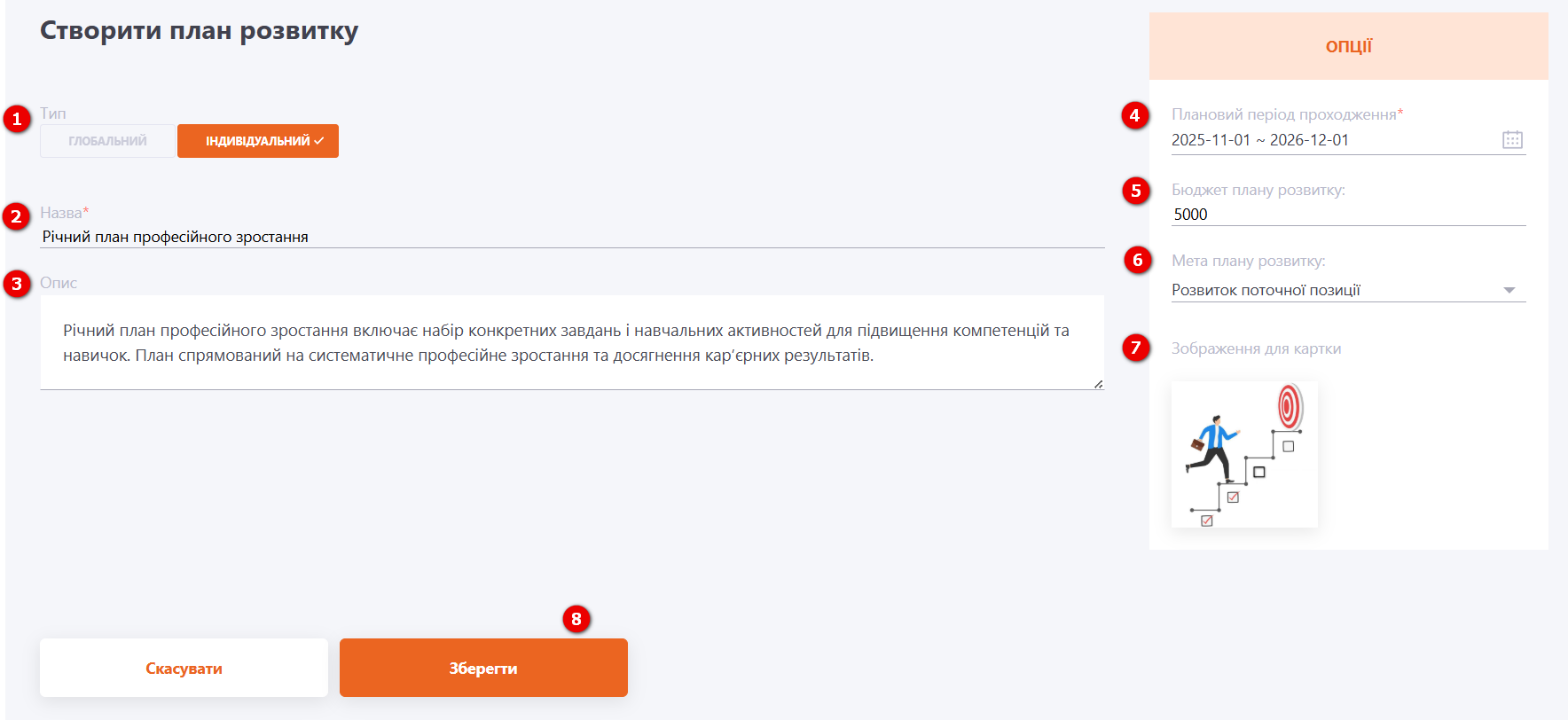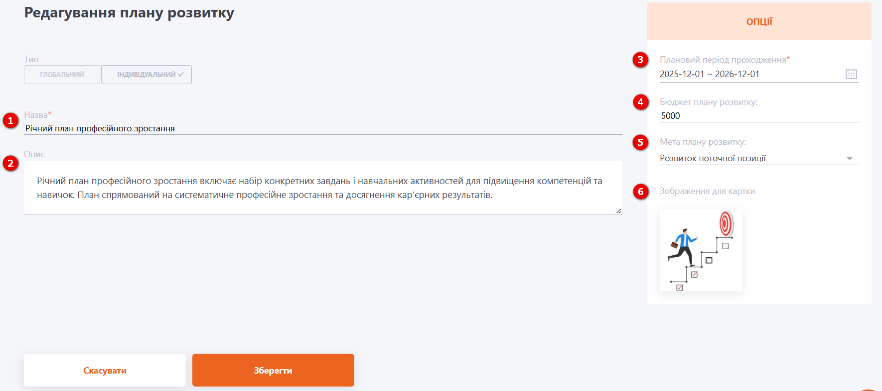 При редагуванні Індивідуального Плану розвитку можна змінити його Назву (1), Опис (2), Плановий період проходження (3), Бюджет плану розвитку (4), Мету плану розвитку (5) та Зображення для картки (6).