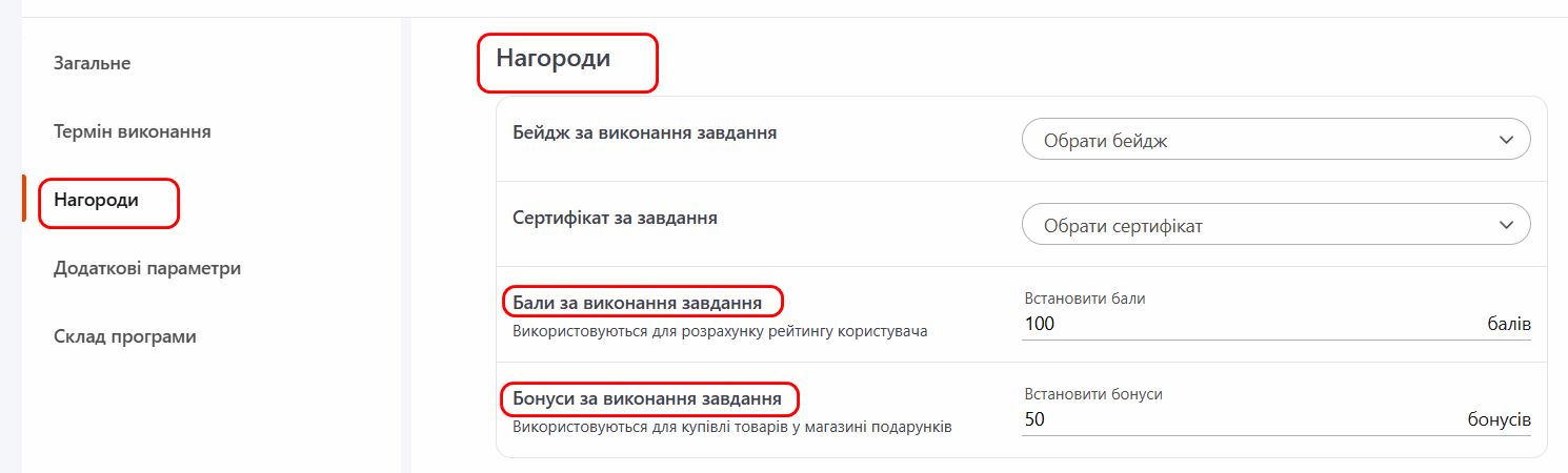 Проте в окремих кейсах потрібно виділити легші та важчі завдання. Адміністратори можуть зробити це встановивши меншу або більшу кількість балів/бонусів за 100% виконання завдання в блоці Налаштування - Нагороди.