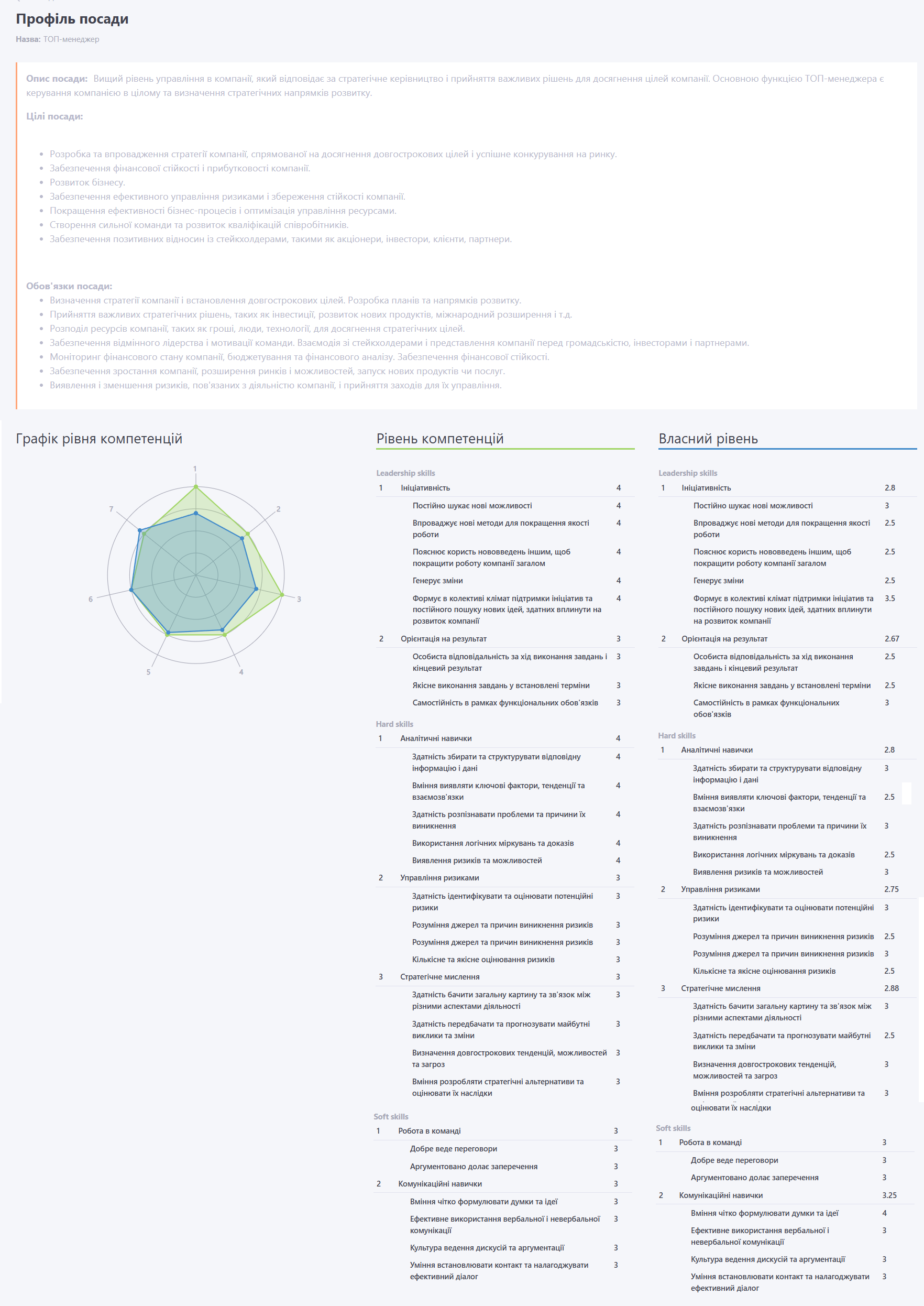 На сторінці "Профіль посади" користувач може переглянути графік рівня компетенцій та інформацію щодо опису, цілей та обов'язків посади у випадку, якщо ці дані було заповнено у профілі посади при його створенні чи редагуванні:
