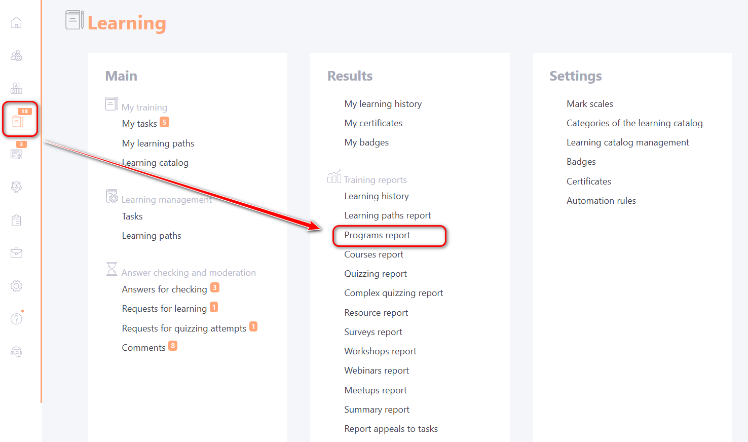 To view reports on training programs, go to Learning - Training reports - Programs report.