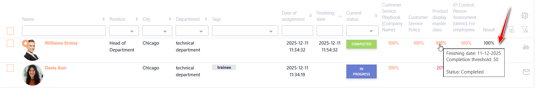 Additionally, for each task of the Program, the completion result is displayed as a percentage. The score for each Program element is clickable and leads to a detailed report showing the completion of that element by an individual user.
