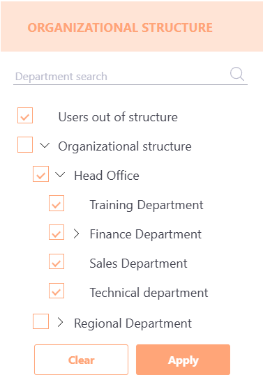 At the top of the list, there is a "Users out of structure" checkbox, which allows filtering users who do not belong to any organizational structure folder.