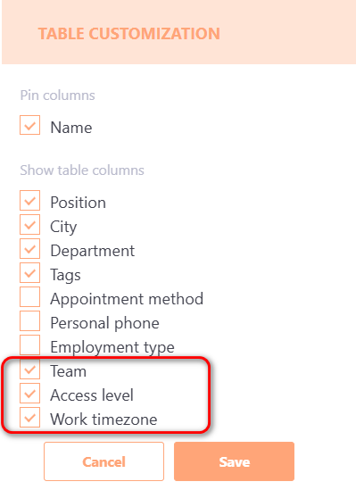 Using the Table customization (12) button, you can configure the display of columns in the report, including additional user fields:
