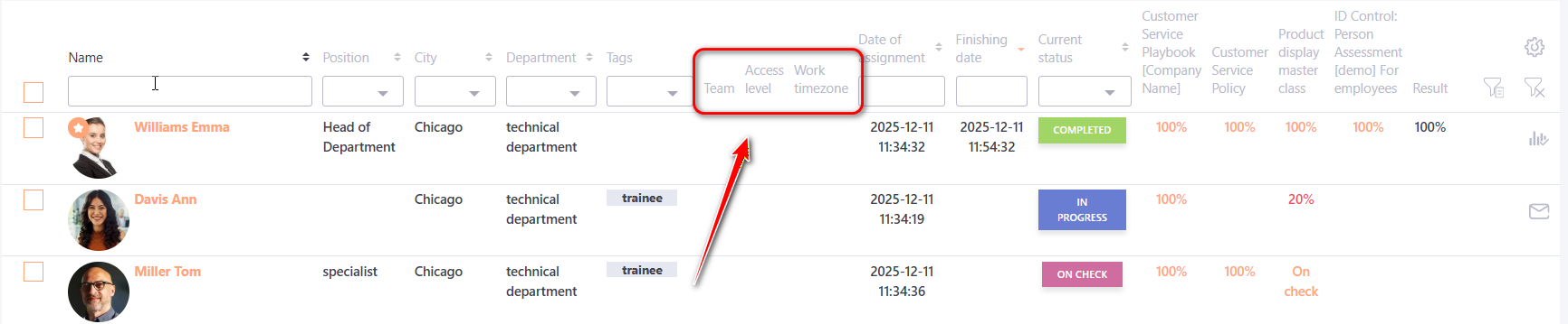 User data (5): Name, Position, City, Department, Tags, Date of assignment, Finishing date, Current Status – all fields are available for filtering and sorting.